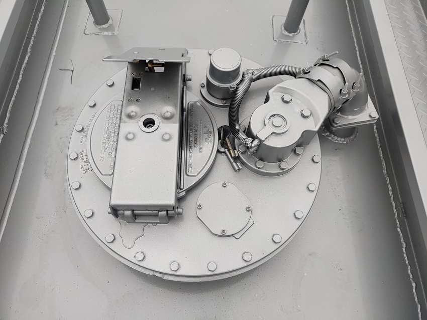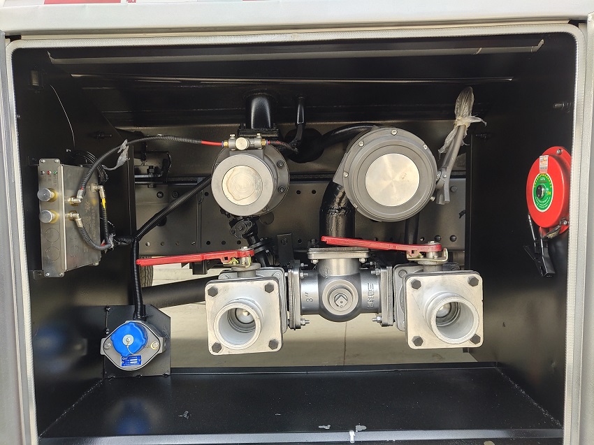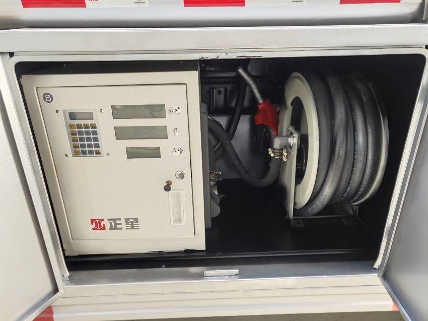 上装:采用程力公告CLW5181GYYD5整车型号,单仓带泵,欧标一套(欧标罐口、智能紧急切断阀、下装油口、油气回收、防溢漏探杆),恒山加油机壹台及15米自带回位卷盘(可选择带小票打印)。附件(后爬梯、活动护栏、钢丝网走道、工具箱),内有防浪板(可采用新式防浪板,可减轻车辆自重,增加罐体强度),前置防爆排气管,灭火器,金属漆,反光条、反光带及“爆”字标识,其他厂标。